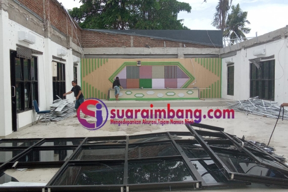 Gedung PLHUT yang berlantai 2 dan memiliki fasilitas modern, kini menjadi perhatian warga sekitar. Petugas dan pegawai sedang membersihkan puing-puing atap dan kaca penyangga ruangan aula yang rusak.