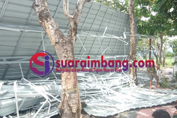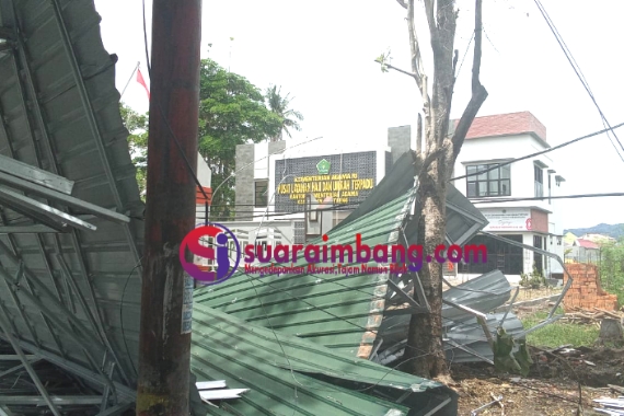 Angin kencang yang disertai hujan deras menyebabkan atap gedung tersebut terbawa angin dan jatuh di depan kantor, menutupi akses jalan perkantoran.