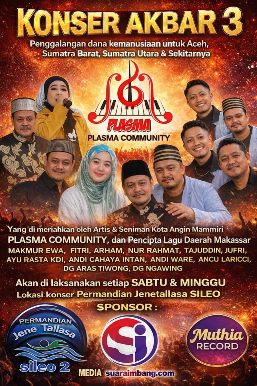 SUARAIMBANG.COM, GOWA – Konser Akbar 3 dijadwalkan akan dilaksanakan pada Hari Sabtu (8/2) dan Minggu (9/2) pekan ini di kawasan wisata Permandian Jenetallasa Sileo, Kabupaten Gowa. Acara ini digelar sebagai upaya bersama untuk mengangkat harkat dan martabat Permandian Jenetallasa Sileo sebagai destinasi wisata keluarga unggulan di wilayah tersebut.